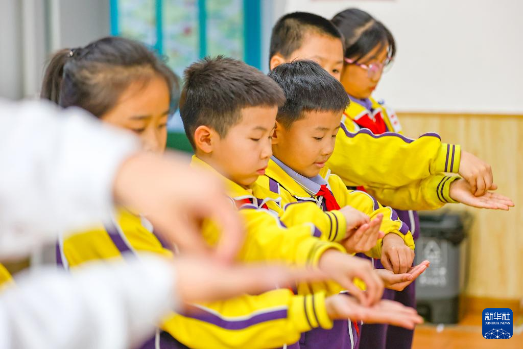 4月7日,在天津市滨海新区塘沽紫云小学,老师指导学生们学习“七步洗手法”。