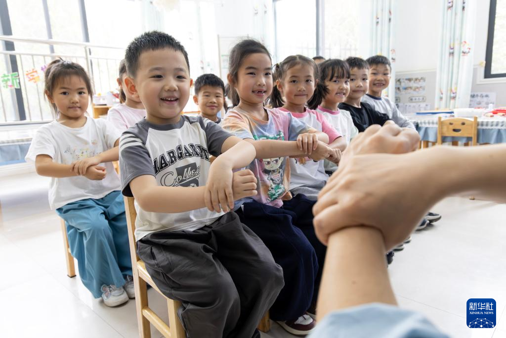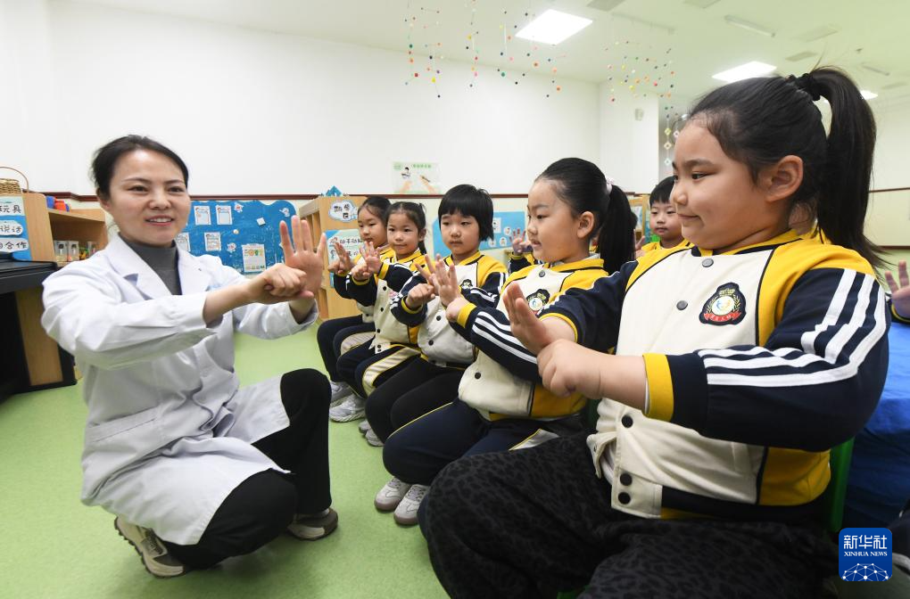 4月7日,在河北省石家庄市华北幼儿园,小朋友在眼科医生的指导下学习眼保健操,科学保护眼睛。