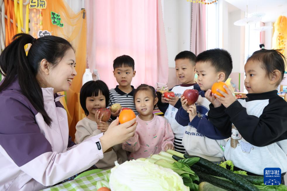 4月7日,在河北省石家庄市新华区柏林幼儿园,校医通过趣味食育课堂引导幼儿养成健康饮食习惯。