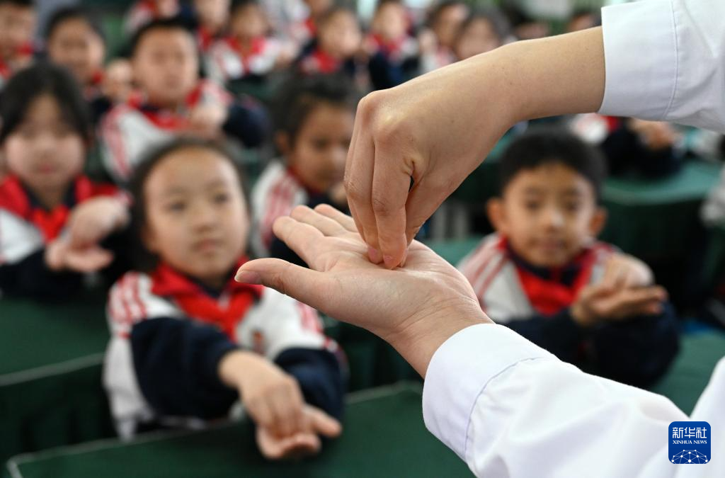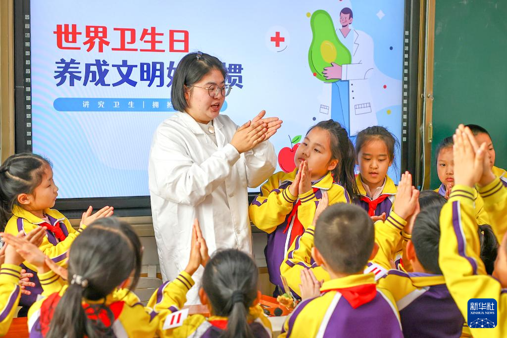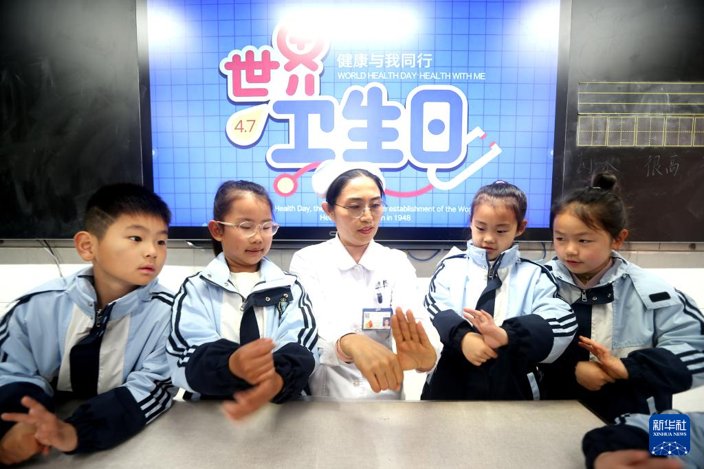 4月7日,河北省邯郸市第二医院医务人员教邯山区实验小学学生正确洗手方法。