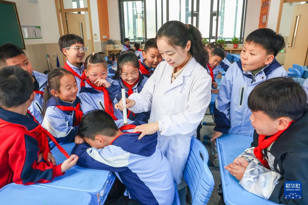 4月7日,在江苏省扬州市江都区仙女小学,扬州市江都中医院医师带领小朋友体验艾灸疗法。