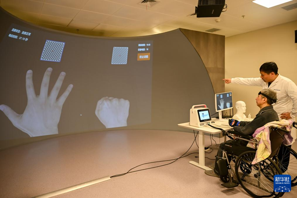 4月7日,在贵州省贵阳市北京积水潭医院贵州医院,医生在指导患者进行脑机接口康复训练。