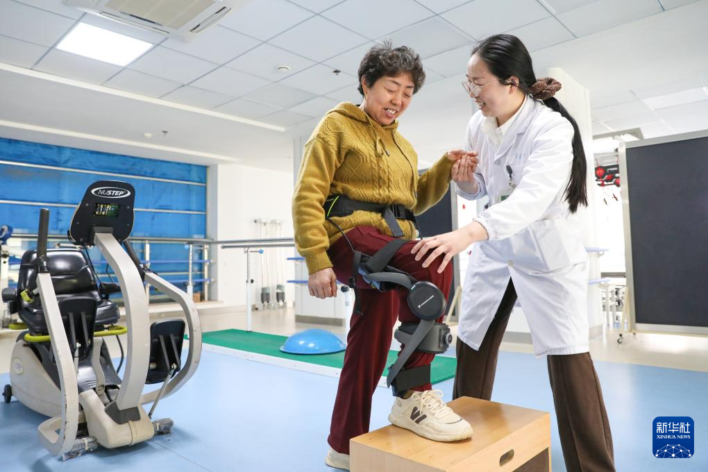 4月7日,在江苏省海安市中医院康复训练中心,患者在治疗师指导下穿戴外骨骼机器人进行康复训练。