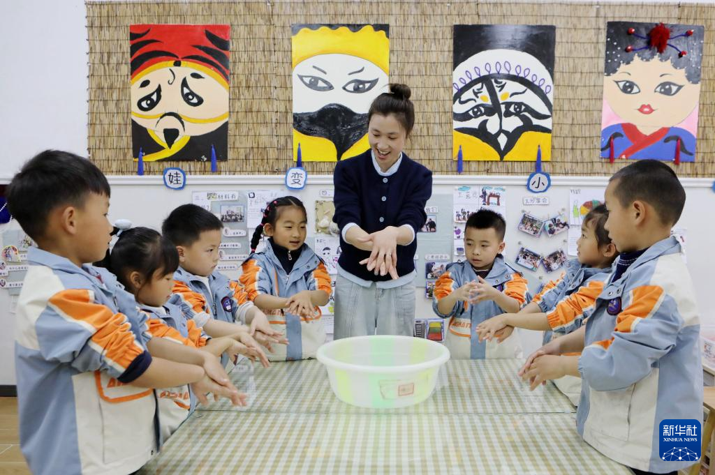 4月7日,在贵州省黔东南苗族侗族自治州施秉县示范幼儿园,小朋友在老师指导下学习“七步洗手法”。