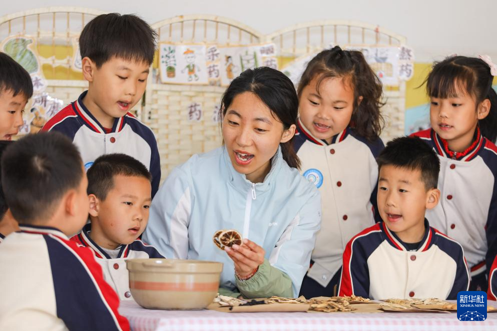 4月7日,在山东省青岛市李沧区青峰路幼儿园,老师教小朋友认识中药材。