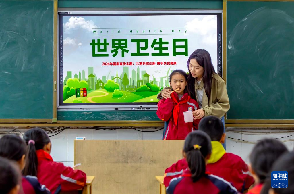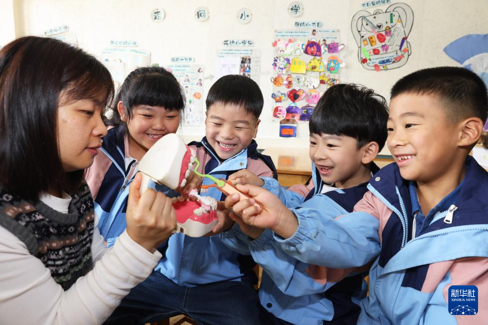 4月7日,老师在贵州省黔西市第一小学指导学生正确涮牙。