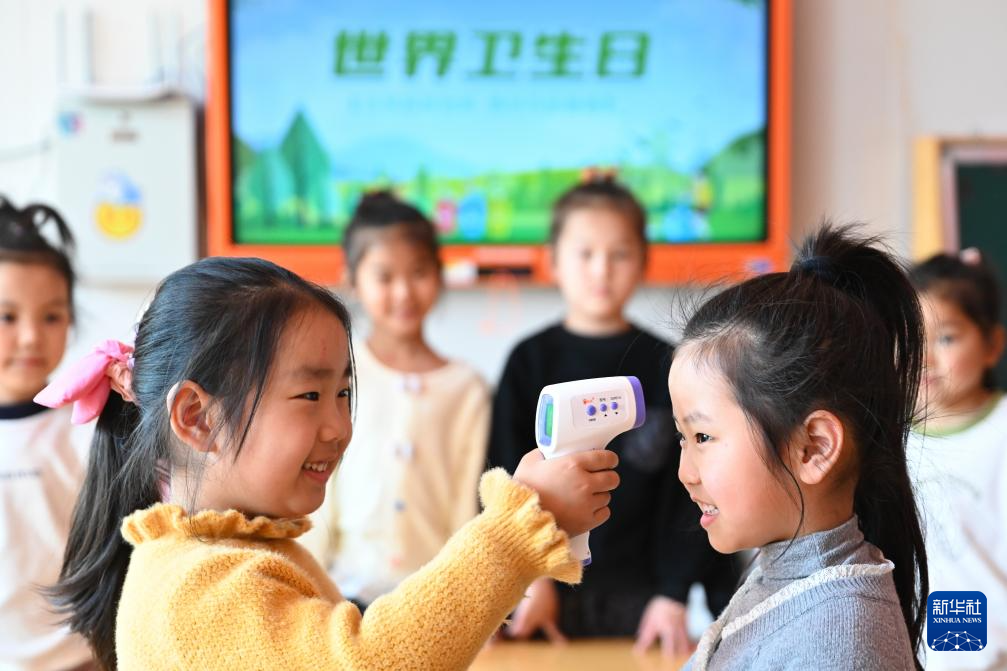 4月7日,在山东省滕州市西岗镇中心幼儿园,小朋友体验测量体温。