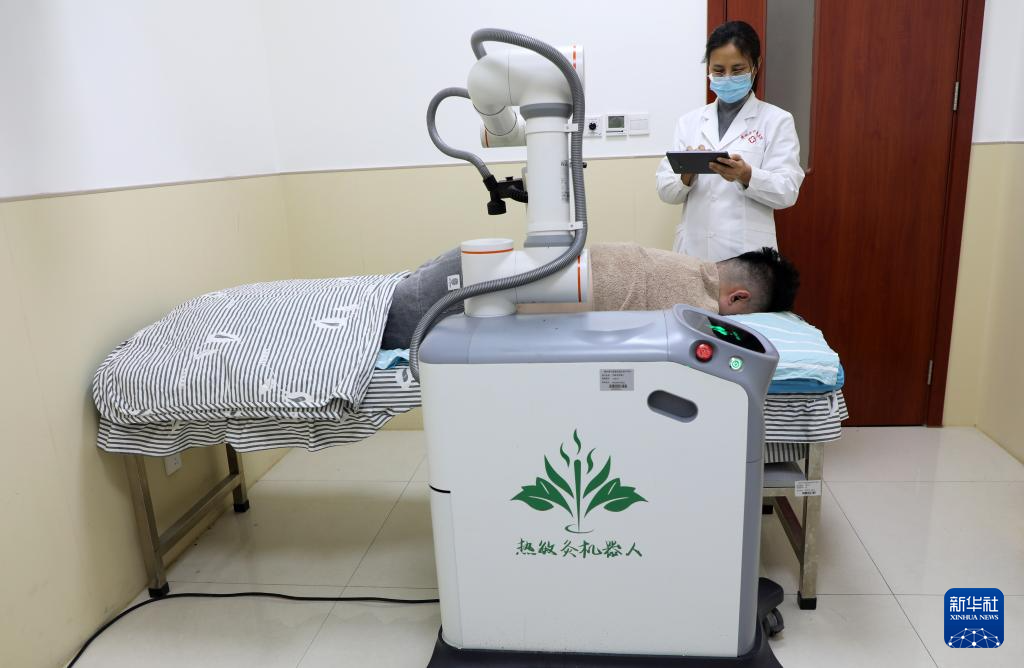 4月7日,在山东省滨州市博兴县中医医院灸疗室,医护人员用热敏灸机器人为患者进行艾灸治疗。