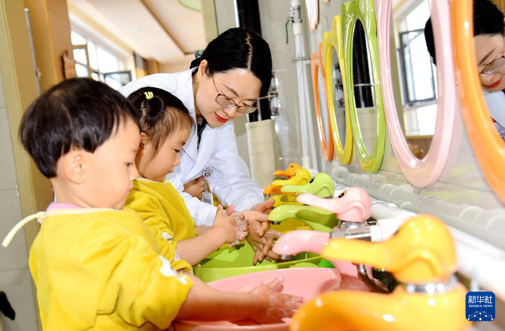4月7日,在甘肃省平凉市静宁县妇幼保健院托育园,医务人员指导孩子们用“七步洗手法”洗手。