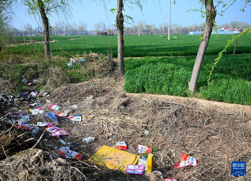 在中部某省一处农田旁,散落着农资袋、地膜、塑料绳等农资废弃物(4月1日摄)。