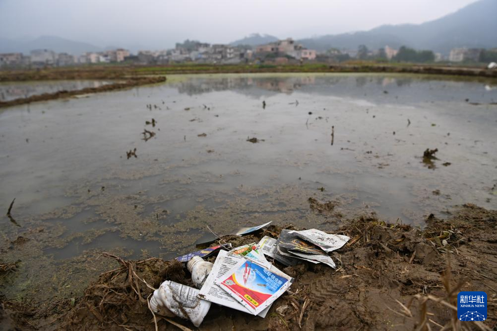 在西南某地一处农田,废弃地膜等农资废弃物被丢弃在田间地头(4月4日摄)。