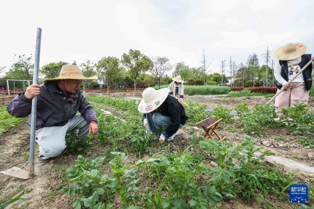 4月8日,在嘉兴市南湖区凤桥镇联丰村王祥里共享菜园,“90后”乡村主理人朱俊(左一)在田垄间带领游客开垦播种,体验农事乐趣。