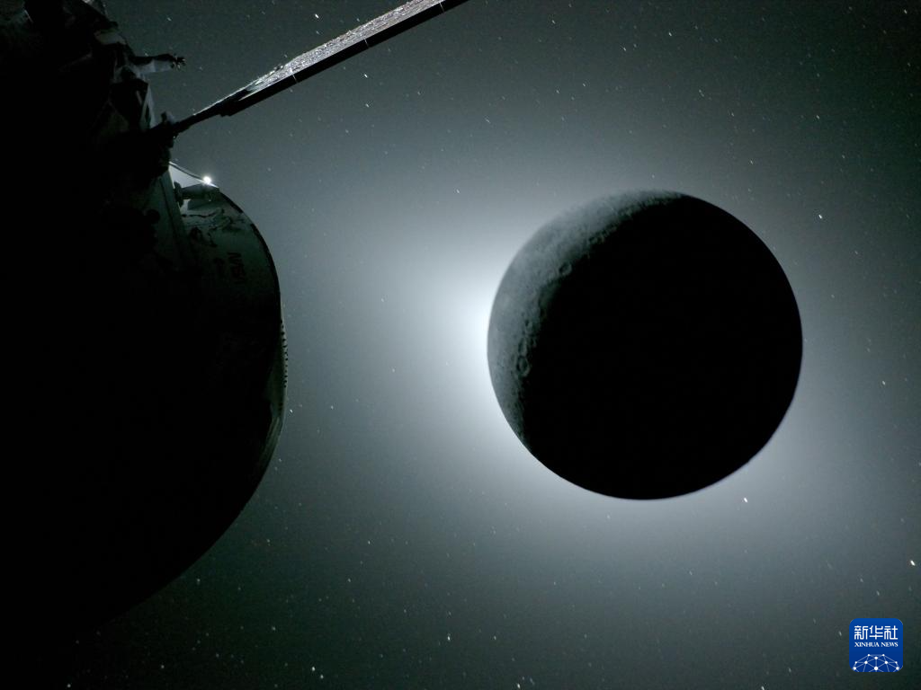 这是从执行“阿耳忒弥斯2号”载人绕月飞行测试任务的“猎户座”飞船上拍摄的月球遮住太阳的时刻(4月6日摄)。