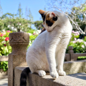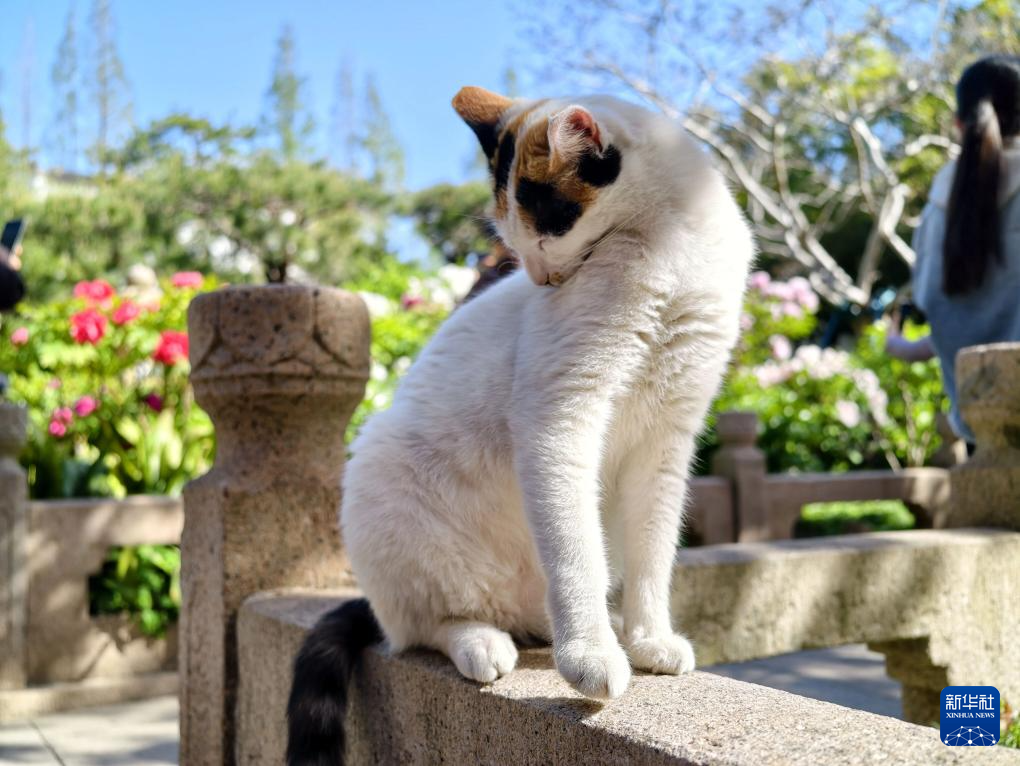 4月7日,一只小猫在上海街头为自己舔毛。
