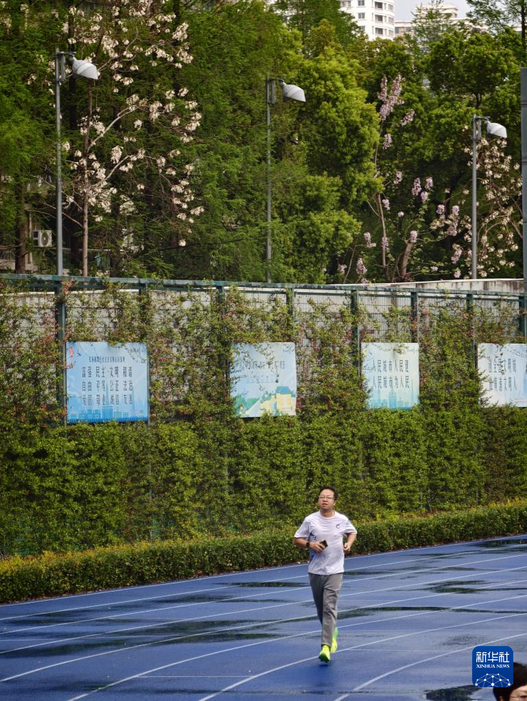 4月9日,市民在上海卢湾体育场晨练。