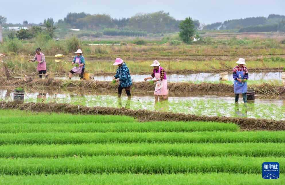 4月7日,广西壮族自治区富川瑶族自治县古城镇农民在进行早稻插秧。
