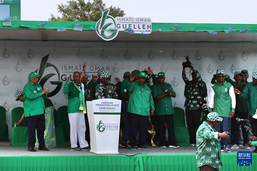 4月8日,吉布提现任总统、执政党争取进步人民联盟候选人盖莱(中)在吉布提首都吉布提市参加竞选活动。