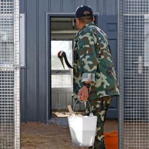 4月9日,在宁夏青铜峡库区湿地自然保护区丹顶鹤标准化适应性训练场,工作人员为丹顶鹤准备食物。