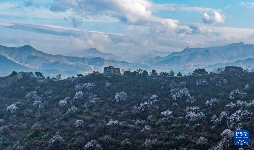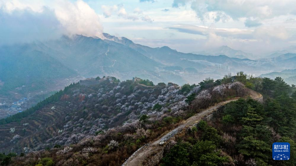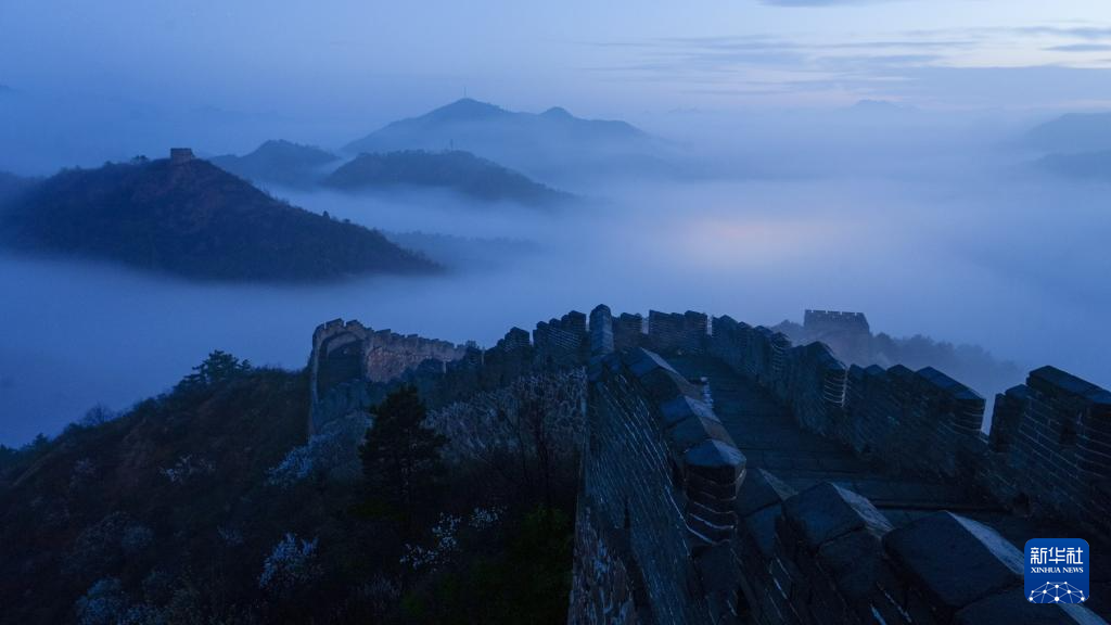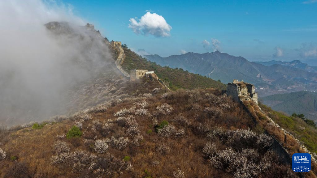 这是4月10日在河北省迁安市拍摄的雨后古长城晨景(无人机照片)。