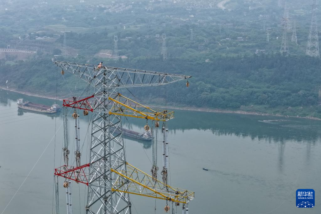 4月11日下午,在位于重庆市江津区珞璜镇的新玉500千伏输变电工程(线路部分)跨长江放线作业现场,国网重庆电力的工作人员使用大载重无人机搭载四段投掷器,牵拉导引绳顺利跨越长江。