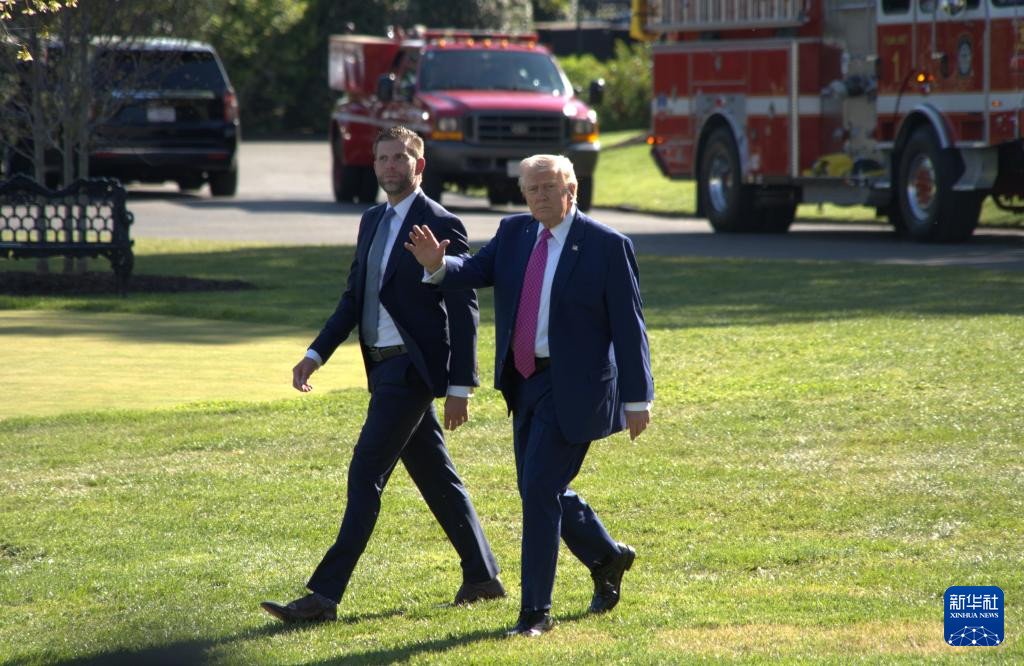 4月10日,美国总统特朗普(右)准备乘直升机离开华盛顿白宫。
