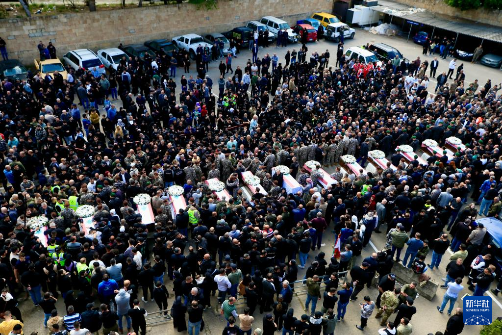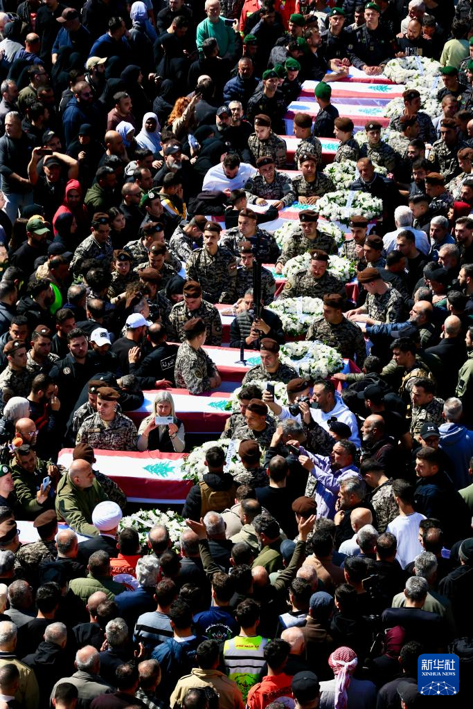 4月11日,在黎巴嫩西顿市,人们参加遭以军空袭丧生的13名安全人员的葬礼。