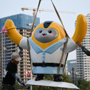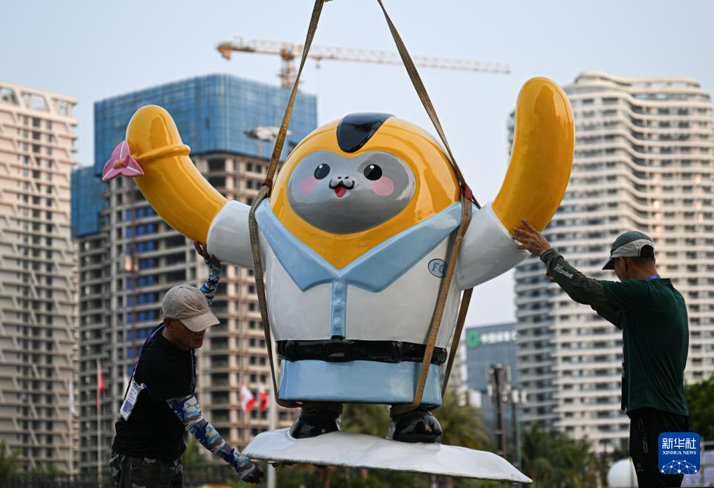 4月10日,工作人员在第六届消博会主会场外吊放消博会吉祥物。