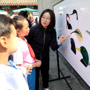 4月11日,工作人员(右一)在北京市颐和园进行科普宣传。