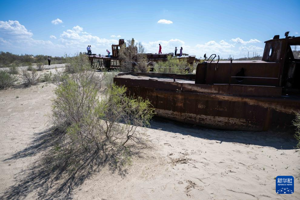4月10日,在乌兹别克斯坦穆伊纳克,游客参观咸海“船舶公墓”。