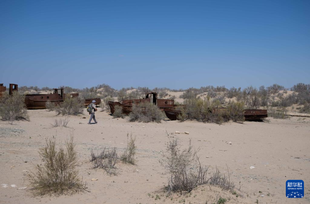 4月10日,在乌兹别克斯坦穆伊纳克,一名男子拍摄咸海“船舶公墓”。