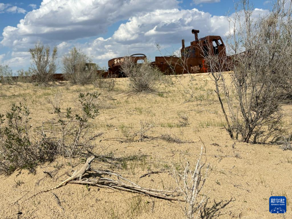 4月10日,在乌兹别克斯坦穆伊纳克,一只蜥蜴站在咸海“船舶公墓”旁。