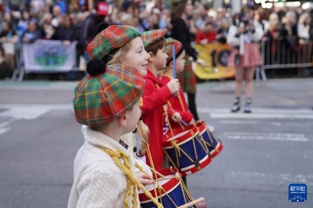 4月11日,儿童在美国纽约参加巡游庆祝苏格兰格纹日。