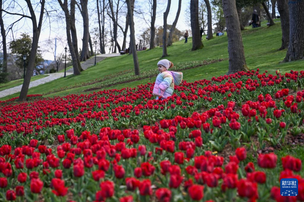 4月11日,在土耳其伊斯坦布尔,一名儿童走进埃米尔安公园的郁金香花丛。