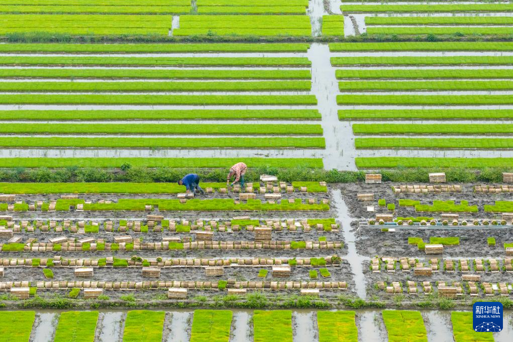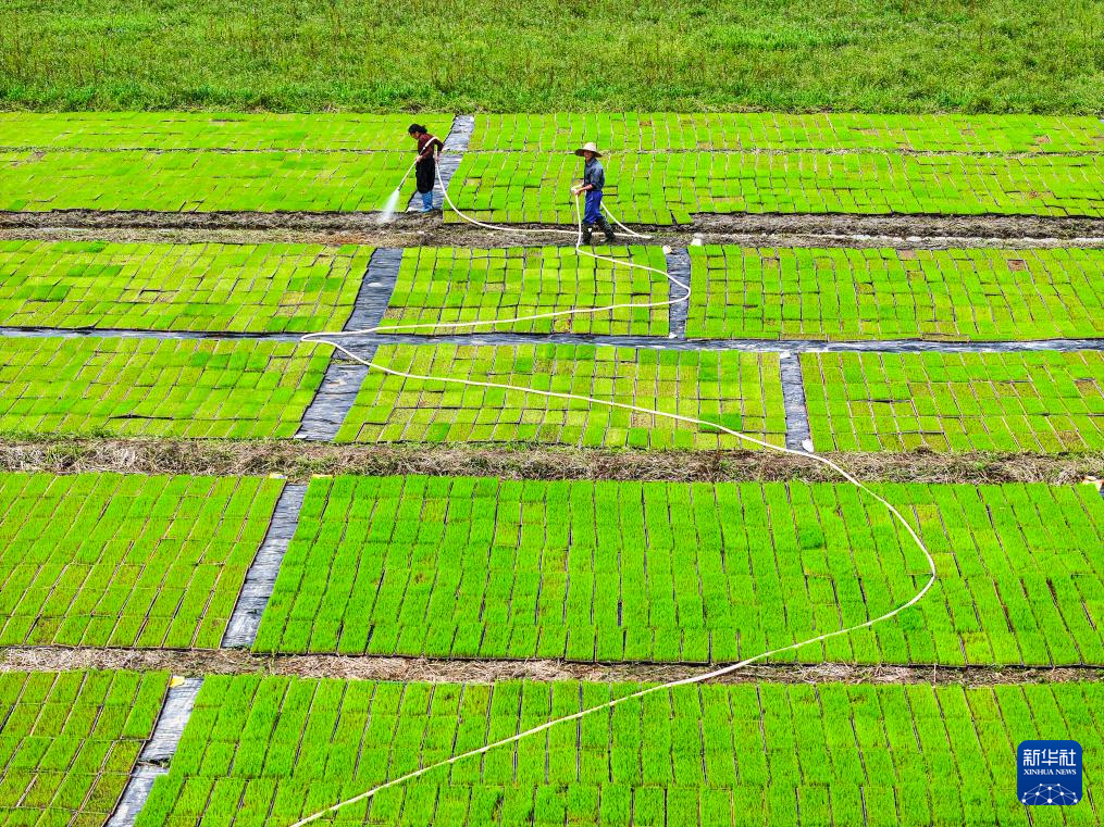 4月9日,湖南省常宁市胜桥镇农民在管护秧苗(无人机照片)。