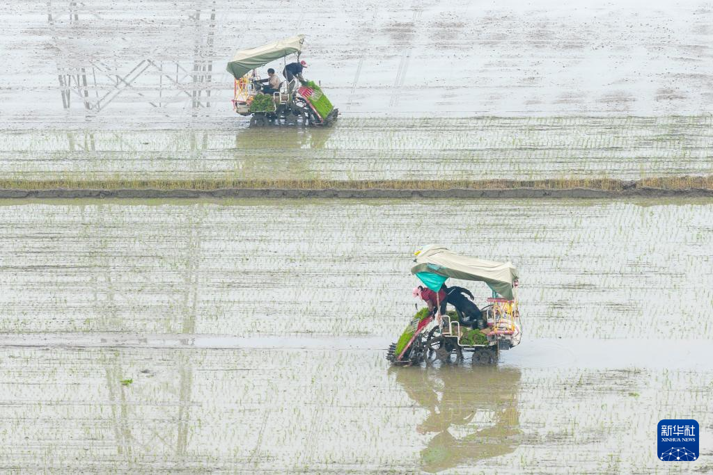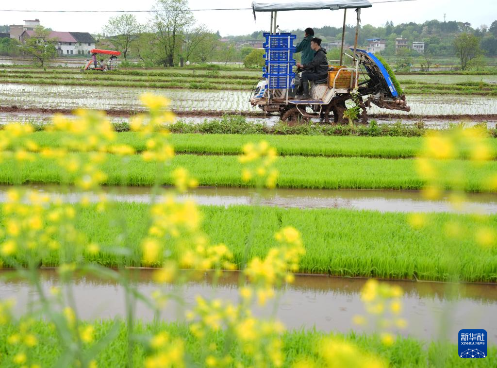 4月11日,湖南省衡阳市祁东县金桥镇村民驾驶插秧机进行早稻插秧工作。