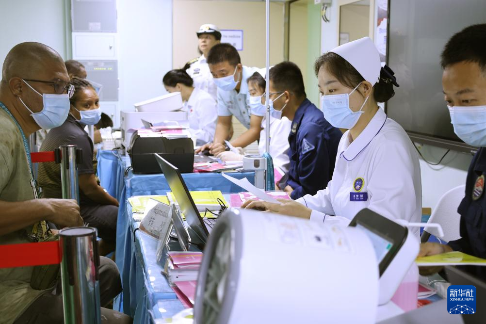 4月11日,执行“和谐使命-2025”任务的中国海军“丝路方舟”号医院船在巴布亚新几内亚开展医疗服务。这是医院船挂号处。