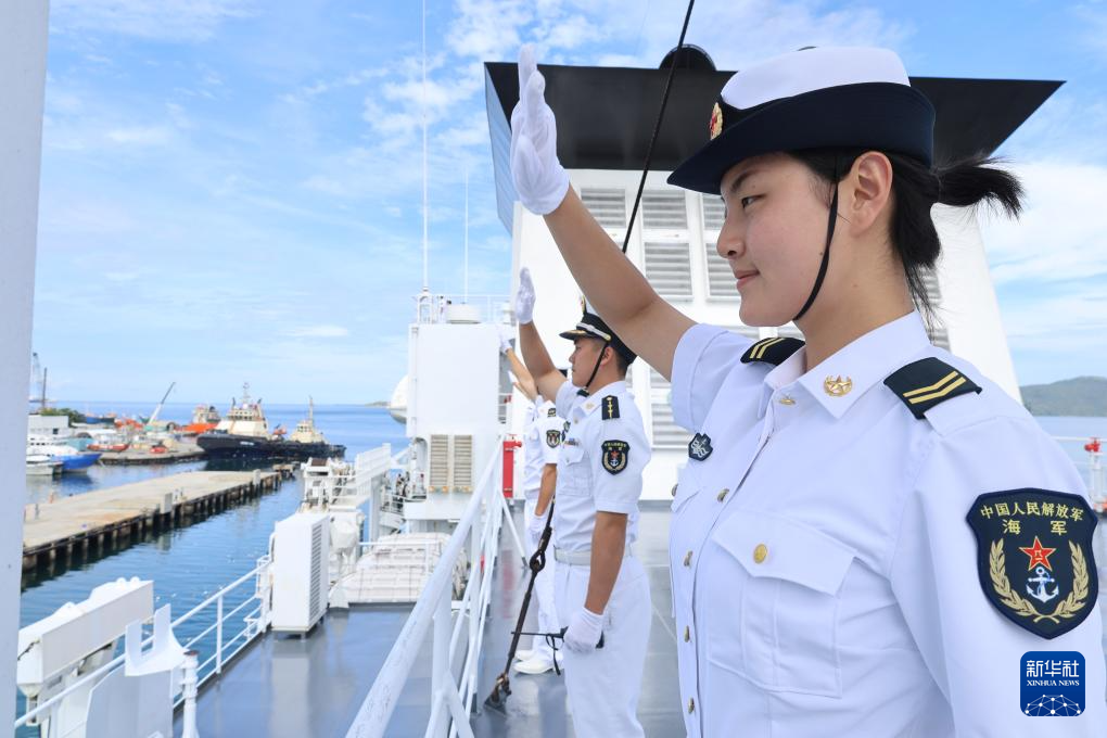 4月15日,执行“和谐使命-2025”任务的中国海军“丝路方舟”号医院船离开巴布亚新几内亚莫尔兹比港。这是码头欢送仪式。