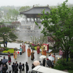 4月15日,游客在温州园博园省市城市展园观看文艺表演。