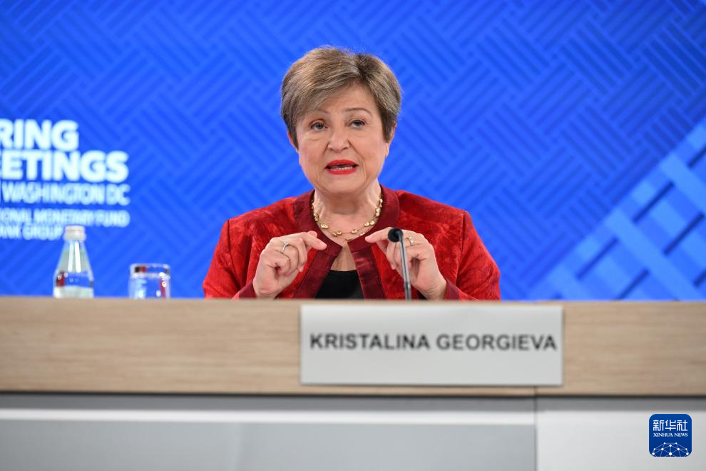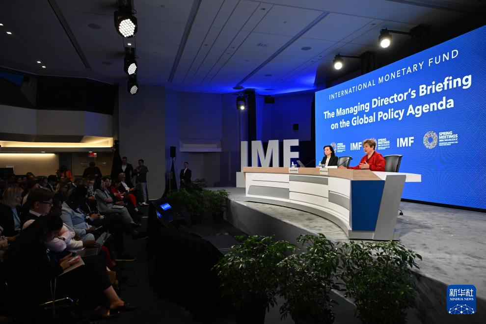 4月15日,在美国首都华盛顿,国际货币基金组织(IMF)总裁格奥尔基耶娃(右)在IMF和世界银行春季会议期间的新闻发布会上讲话。