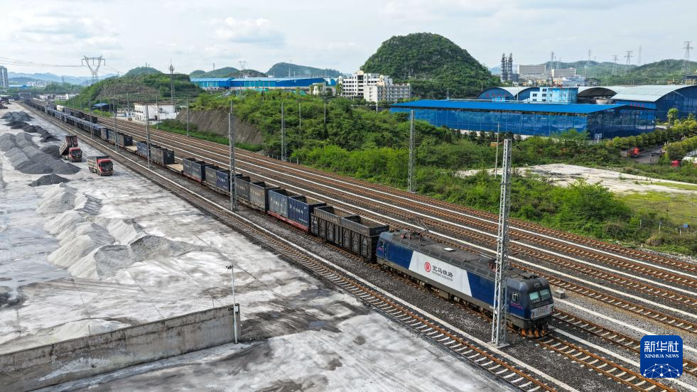 4月16日,运输化肥原材料的列车在贵州瓮马铁路上行驶(无人机照片)。