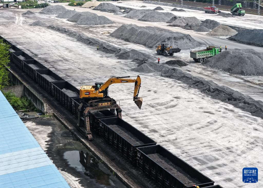4月16日,在贵州瓮马铁路牛场站,中铁二十局瓮马铁路运营分公司的工人在转运化肥原材料(无人机照片)。