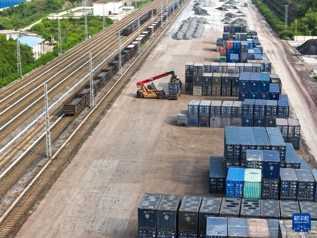 4月16日,在贵州瓮马铁路瓮安站,中铁二十局瓮马铁路运营分公司的工人在转运化肥(无人机照片)。