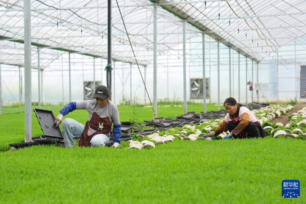 4月16日,在湖南省益阳市南县南洲镇,工人在育秧大棚内整理早稻秧苗。