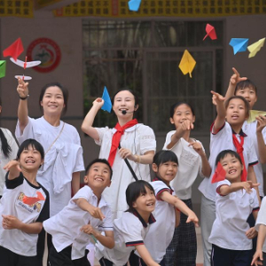 4月16日,在梧州市长洲区倒水镇大桥小学,送教老师和学生一起放纸飞机。