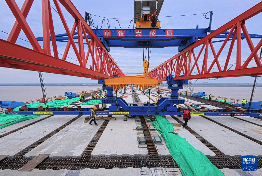 4月16日拍摄的崇启公铁长江大桥铁路作业面施工现场。