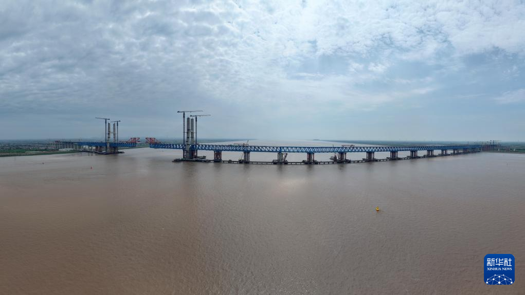 4月16日,建设中的崇启公铁长江大桥(无人机全景照片)。