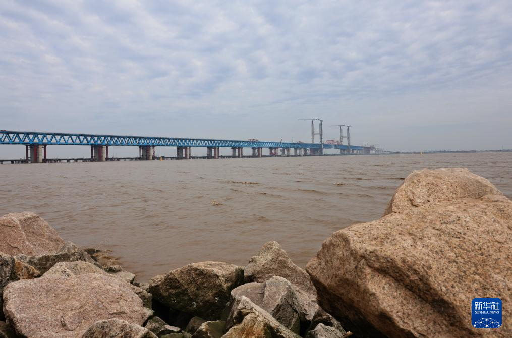 4月16日拍摄的建设中的崇启公铁长江大桥。