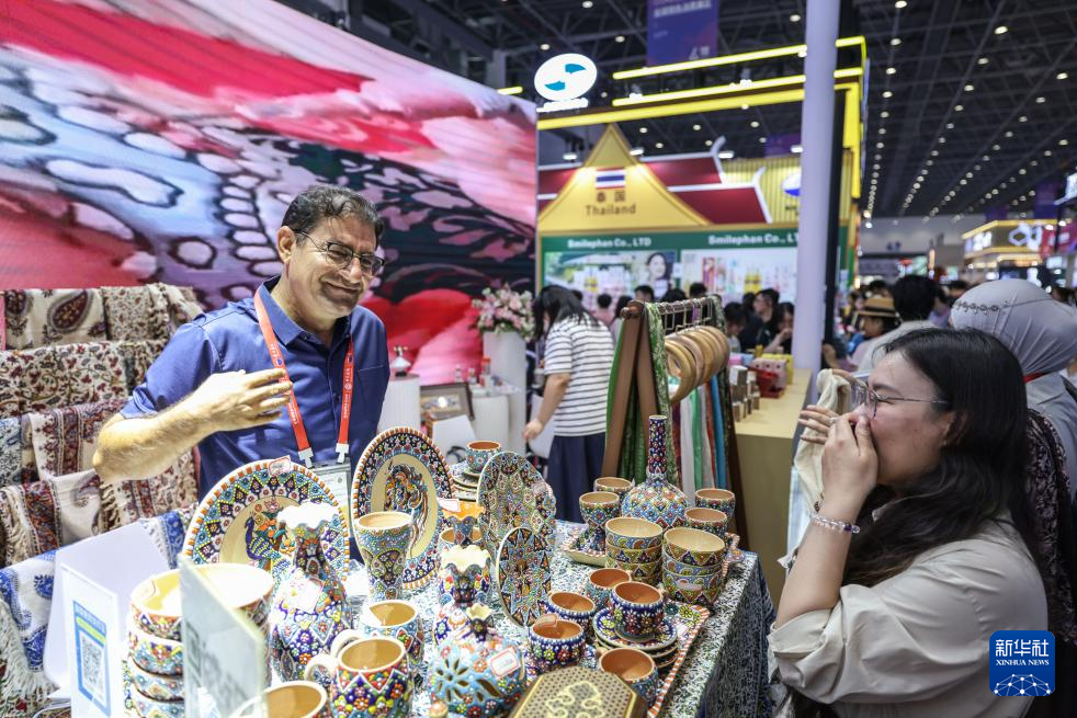 4月15日,观众在第六届消博会现场了解伊朗工艺品。