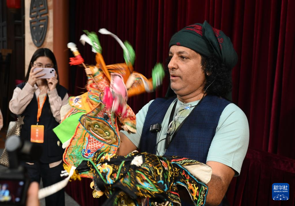 4月16日,阿拉伯艺术家在漳州木偶艺术表演馆学习布袋木偶戏表演。