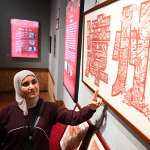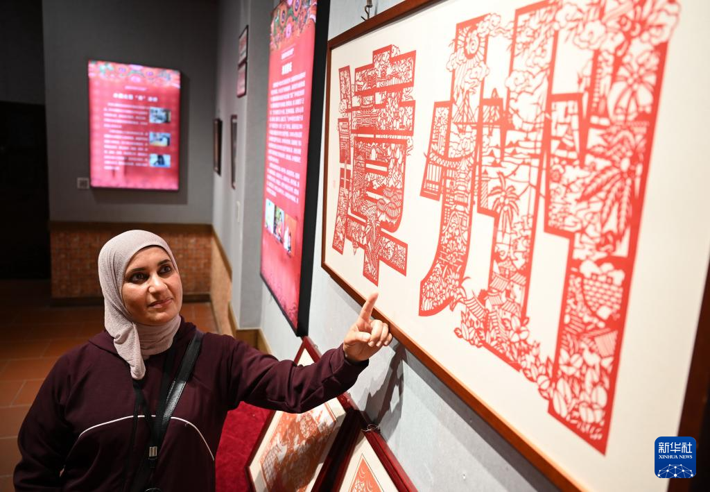 4月16日,阿拉伯艺术家在漳州市非物质文化遗产展示馆观赏剪纸艺术作品。